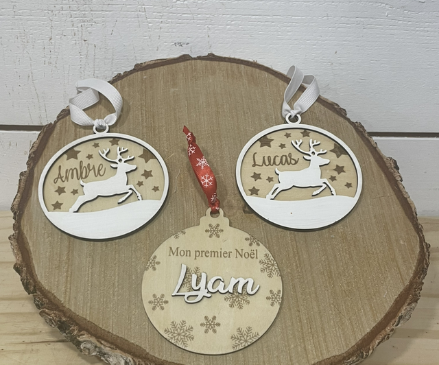 Apportez une touche unique à votre sapin avec nos décorations en bois gravées et personnalisées. Chaque pièce, peut être gravée avec le prénom de votre choix. Un souvenir tendre et intemporel à offrir ou à conserver.